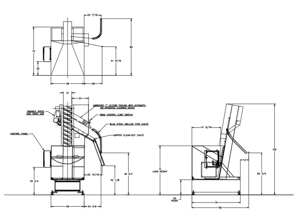Feed from a random loaded, floor mounted hopper. The Differential Pinion Shafts will be elevated from the hopper via a cleated belt and discharged above the floor axis horizontal, or at a 30° angle.