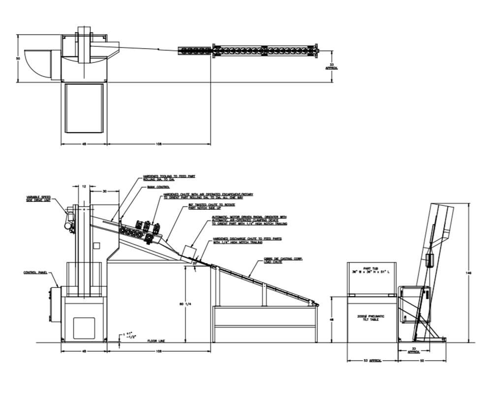 Feed from a random loaded, floor mounted hopper. The Die Castings will be elevated from the hopper via a cleated belt and discharged rolling diameter to diameter. The parts will then be radial oriented by a raised notch within 4-5 degrees and rotated flat with notches up.